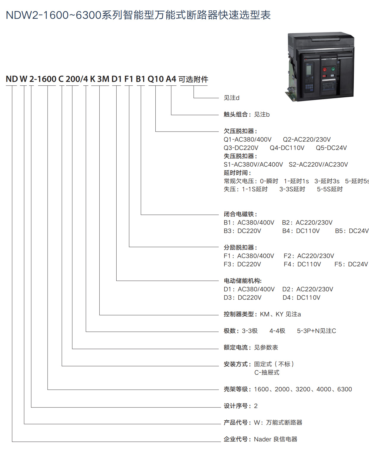 NDW2 系列万能式断路器(以下简称断路器),适用于交流 50Hz/60Hz,额定电流 200A~6300A、 额定绝缘电压 1250V、额定工作电压为 AC220V/230V/240V、AC380V/400V/415V、AC440V/480V、 AC660V/690V 的配电网络中,NDW2-4000 和 NDW2-6300 还可以用在额定工作电压 AC800V、 AC1000V/AC1140V(额定绝缘电压 1250V)的配电网络中,用来分配电能和保护线路及电源设备免受过 载、欠电压、短路、单相接地等故障的危害。同时也可以作为隔离开关使用。断路器具有多种保护功能, 可做到高精确的选择性保护,避免不必要的停电,提高供电系统可靠性、安全性。